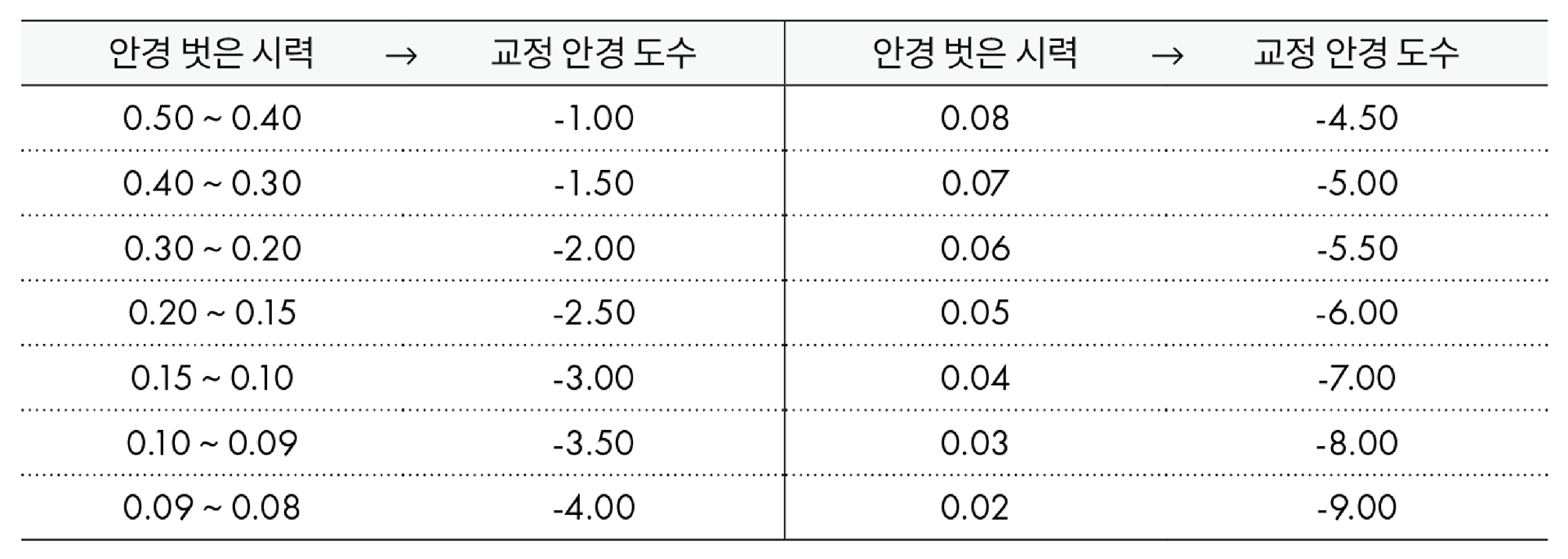 * 안경 벗은 시력에 따른 권장 착용 도수입니다. 보다 정확한 도수는 안경원에 방문하여 안경사 상담 후 결정하시기 바랍니다.